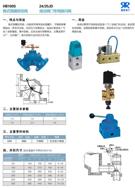 HB100S型角型隔膜式排泥閥是一種角型隔膜式截止類閥門。通常安裝在污水處理廠沉定池底部,用以排除池底沉定的泥和污物。角式隔膜排泥閥內部為尼龍強化橡膠隔膜,并設計為角型結構,利用污物的順利排除,安裝方便,使用壽命長。