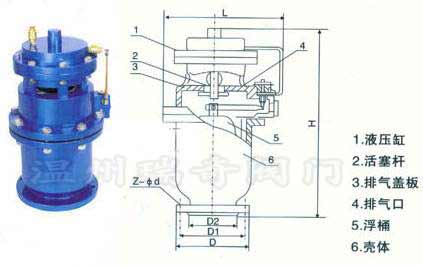 本閥由下閥體,中閥體,浮筒,浮筒桿,閥芯,蓋板,活塞桿,膜片及閥蓋等組成的全壓高速排氣閥,其特征是通過銷軸與浮筒鉸接的浮筒桿可繞主軸轉(zhuǎn)動,并由此實現(xiàn)通過浮筒升降控制閥芯的升降啟閉,即當浮筒下降(閥體里充滿氣體)時,閥芯上升,打開小閥口,并關(guān)閉小排氣帽上的排氣口,使氣體通過導(dǎo)管進入液壓罐內(nèi),當浮筒在浮力作用下上升時候,閥芯下降,關(guān)閉小閥口,同時打開排氣帽上的排氣口,使液壓罐通過導(dǎo)管,直通大氣泄壓,且當浮筒下降,液壓缸內(nèi)充滿氣體時,閥門上的大排氣口自動關(guān)閉。當水泵停止,管內(nèi)水流空時或遇到管內(nèi)產(chǎn)生負壓時,吸入空氣,確保管線安全。