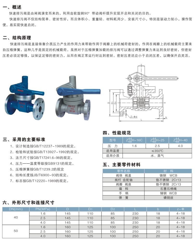 快速排污閥是由閘閥演變而來的,利用齒輪轉90℃帶動閥桿提升實現開啟和關閉的目的。