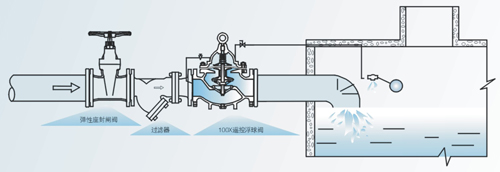 100X隔膜式遙控浮球閥是兼具多種功能的水力操作式閥門.主要安裝于水池或高架水塔的進水口i處,當水位達